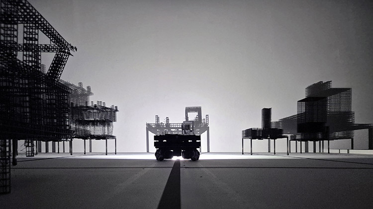 A la galerie de l’Ordre des architectes, on pouvait voir Taotie de Thomas Garnier. Les Taoties sont des créatures de la mythologie chinoise, or il s’agit ici d’une installation lumineuse renvoyant au théâtre d’ombres qui compte parmi les expériences pré-cinématographiques. Mais dans ce cas, c’est un robot, conçu par l’artiste, qui déplace des structures imprimées en trois dimensions. Équipé d’une lumière, il projette ce qui a l’apparence d’une ville en filaire toute de transparence. Le spectacle de construction/déconstruction qui se joue sous nos yeux, en cette époque d’extrême automatisation, convoque les chaînes logistiques des entrepôts entièrement robotisés. Là où il n’y a pas âme qui vive mais uniquement des machines dont les ballets incessants, parfaitement organisés, sont au service de notre consommation effrénée.