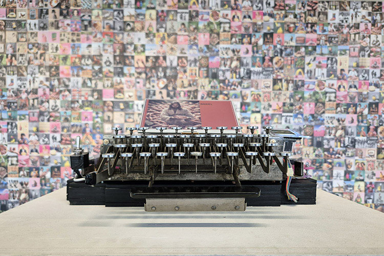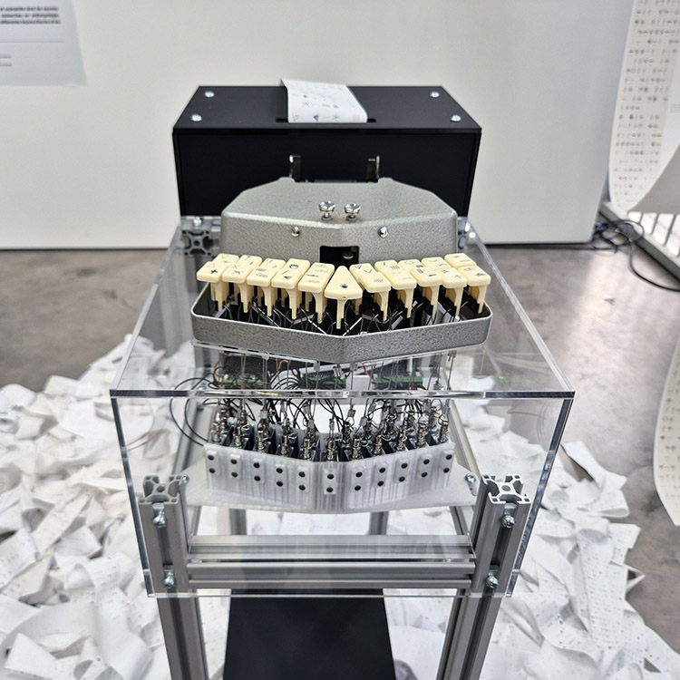 Toujours aux Halles Samoa, une autre machine est à la tâche. Intitulée L’archéosténographe par ses autrices Véronique Béland et Julie Hétu, elle nous apparaît tout aussi “infatigable”. Ayant l’allure d’une sténotype, initialement dédiée à la saisie rapide de textes en phonétique, elle retranscrit en signes préhistoriques les mythes sur le futur de l’humanité qu’une intelligence artificielle lui dicte. La coexistence des temporalités, allant des temps anciens à des futurs lointain en passant par la mécanique d’un passé immédiat, est pour le moins inattendue. Avec l’intelligence artificielle qui s’invite actuellement dans des domaines aussi variés que le déchiffrement de caractères antiques, la retranscription de nos visioconférences ou la prédiction de comportements en devenir !