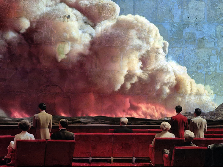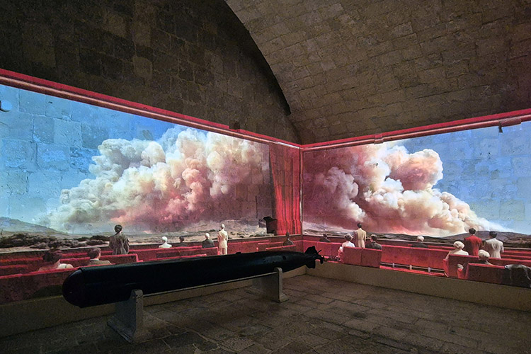 L’artiste français a spécialement conçu une installation immersive (projetée à même les pierres du fort) qui s’inscrit dans la continuité de sa série Incendies produite avec de l’intelligence artificielle. L’exposition s’intitule Facing the Challenge, où l’on comprend que le défi à relever est celui du réchauffement climatique, sachant que notre responsabilité collective ne fait plus aucun doute comme s’accorde à le démontrer la communauté scientifique depuis les années 2010. La situation imaginée par Louis-Paul Caron est quelque peu complexe car on ne sait pas exactement si les protagonistes observent le film d’un incendie ou un véritable incendie. Après avoir été le décor de films comme Midnight Express ou Gladiator, le Fort Saint-Elme devient ainsi le théâtre d’une torpeur collective dont nous devons nous extraire pour faire face aux incertitudes à venir.
